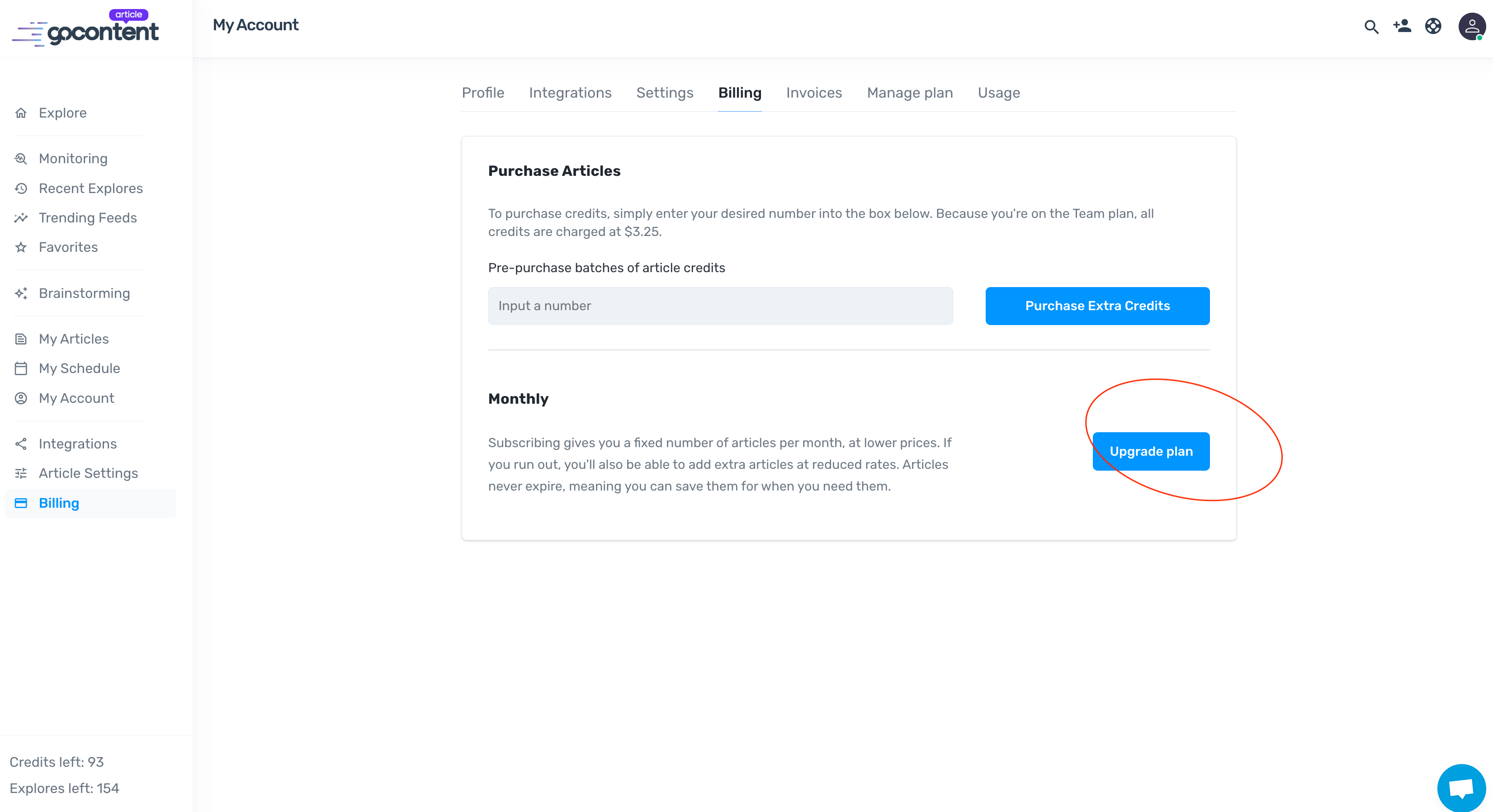 To change your plan, click on '**upgrade plan**' and choose your new monthly subscription.