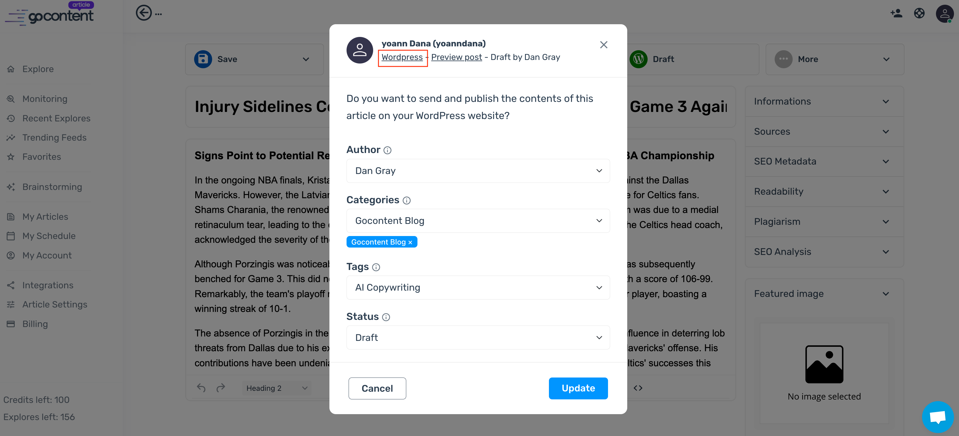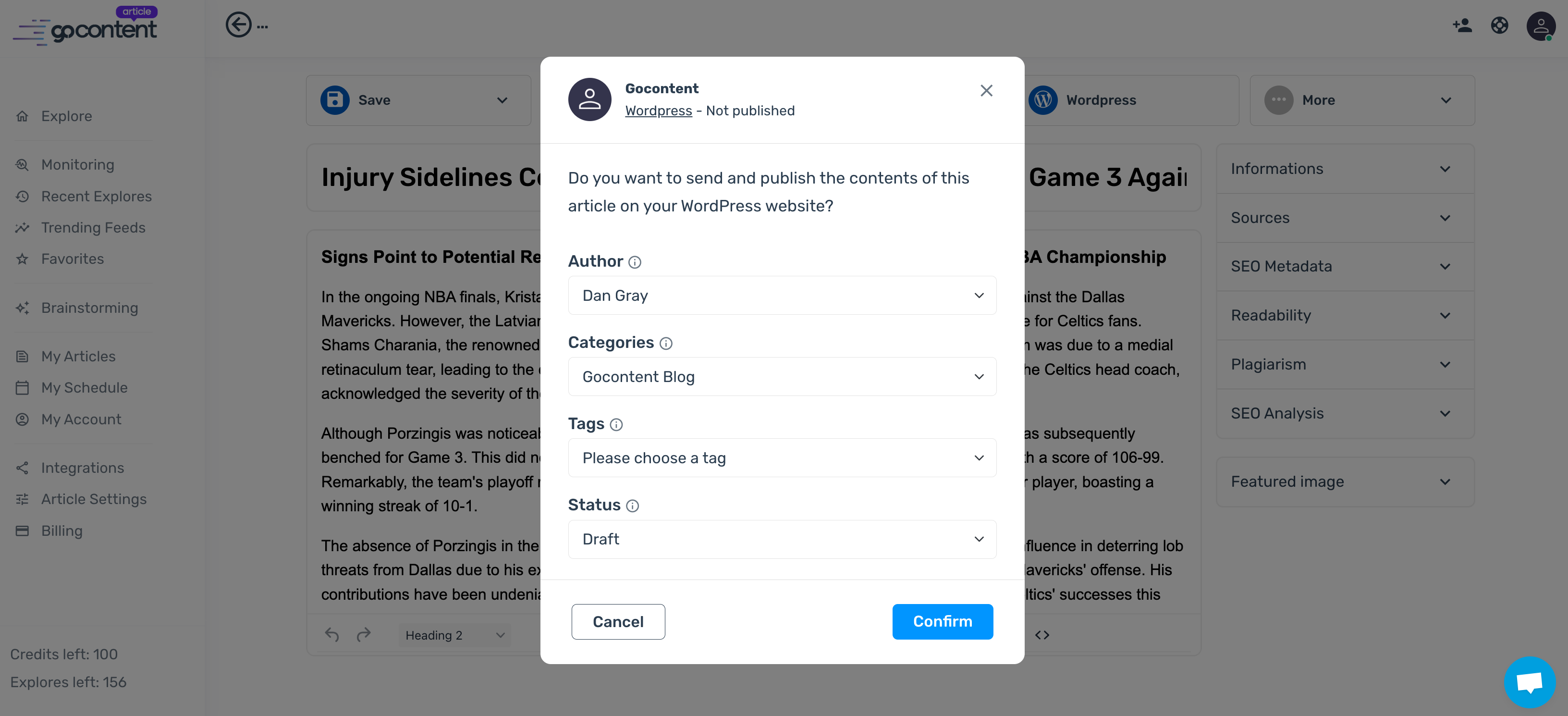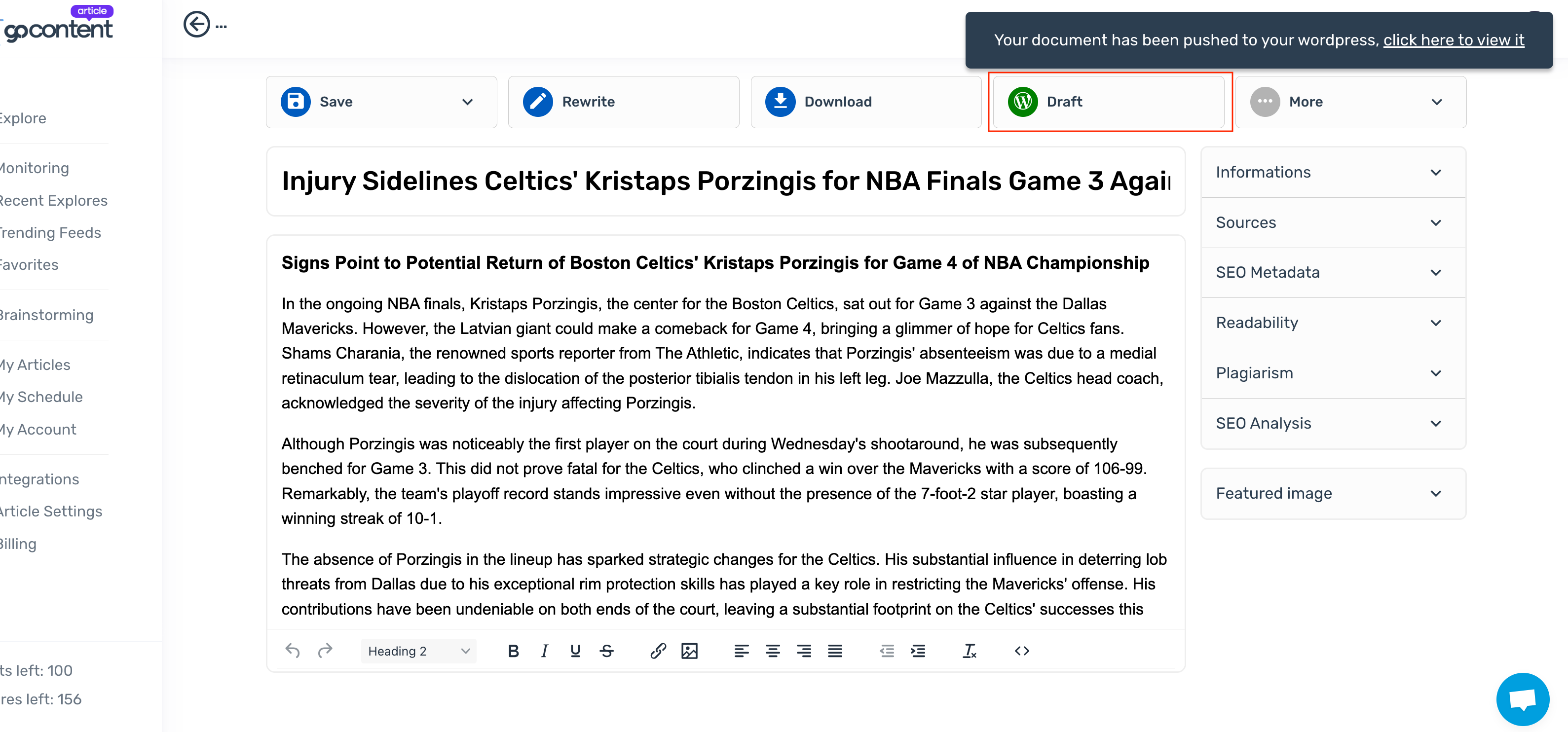 * **Draft:** Your article is published on WordPress as a draft.&#x20;