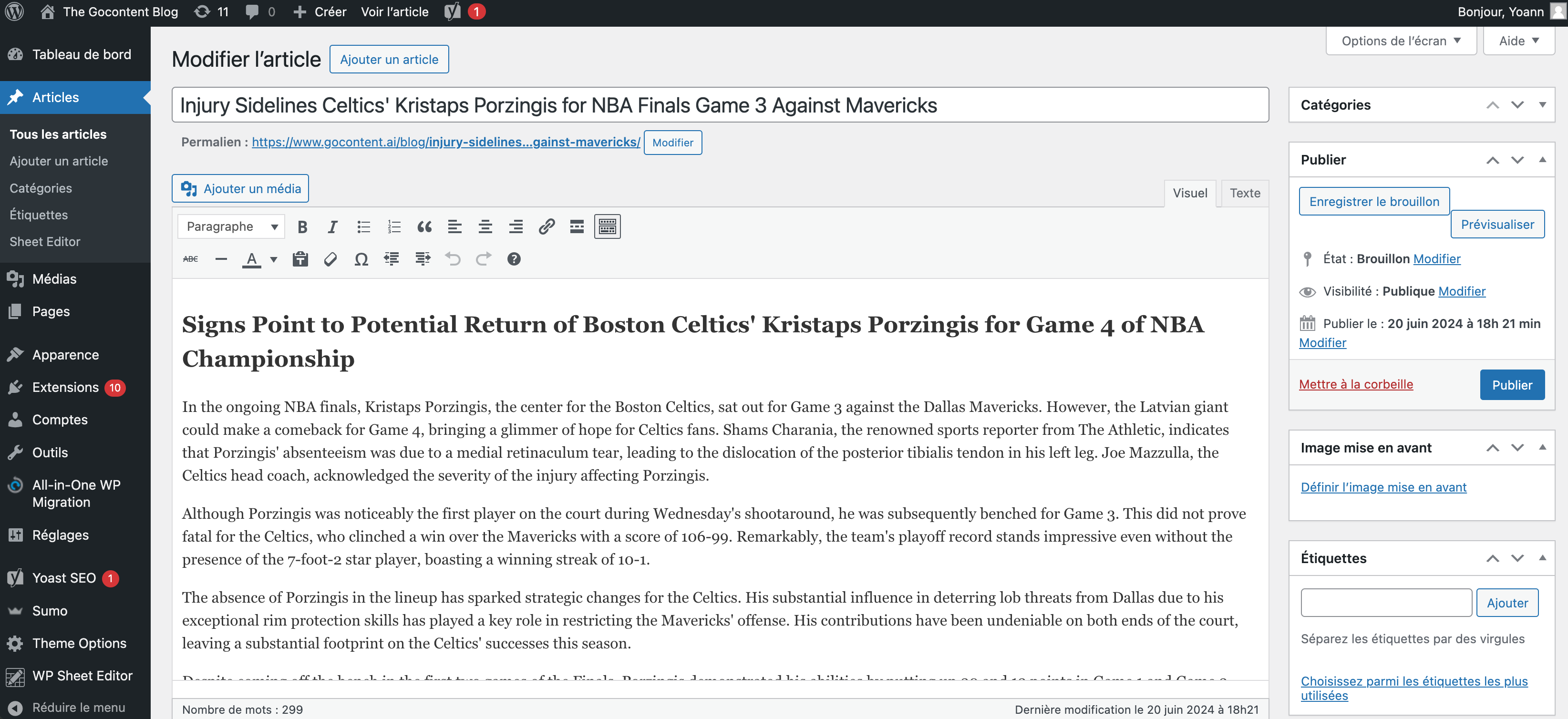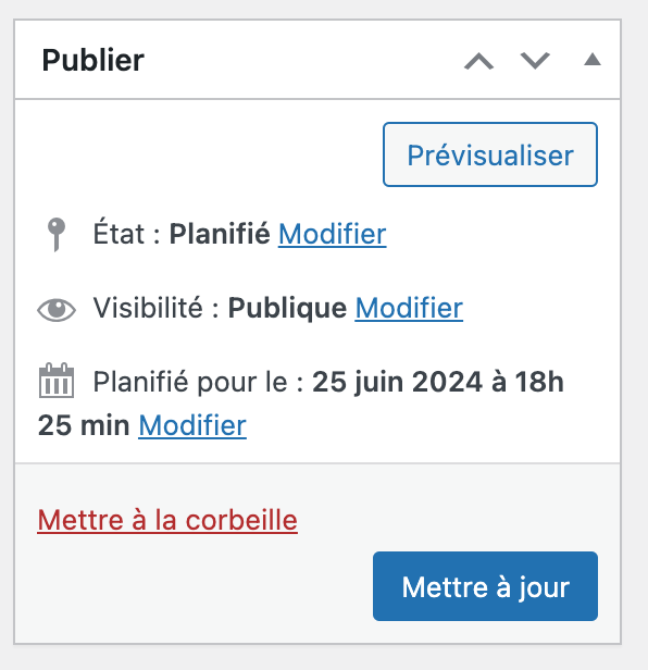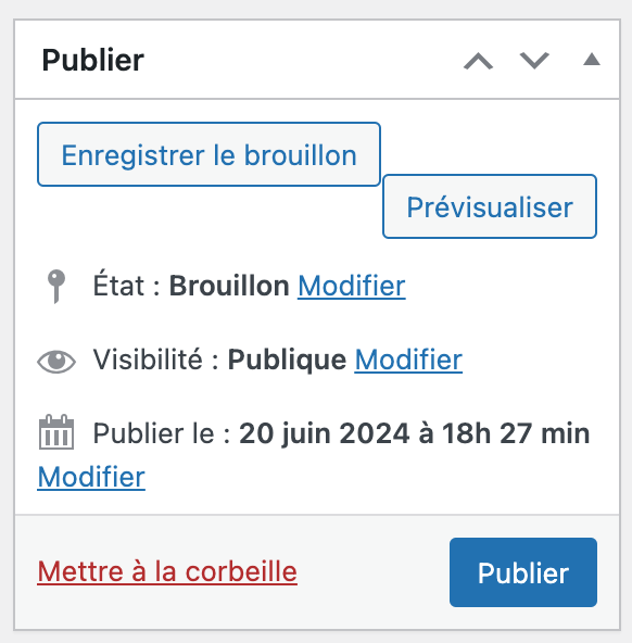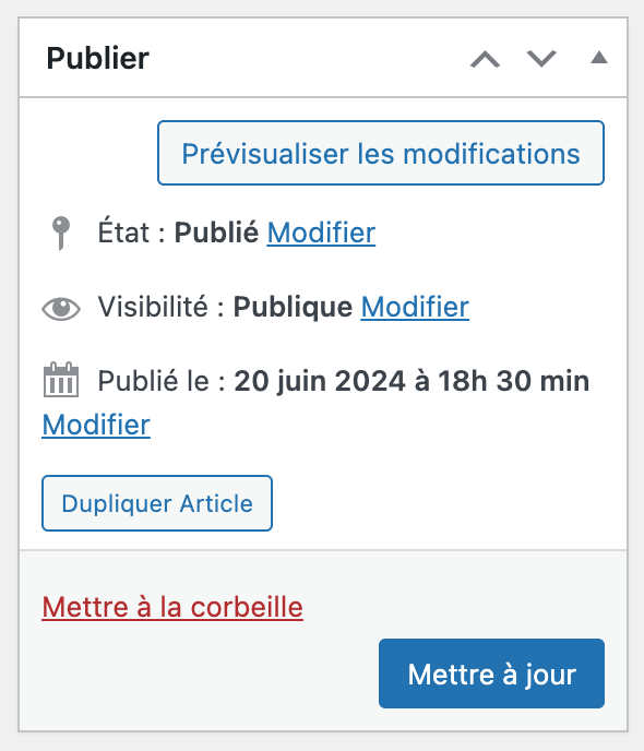 You can check the status of your article, which has turned green in the banner above the article. If you wish to change the publication settings on WordPress, click on the green button where the article status is displayed.
